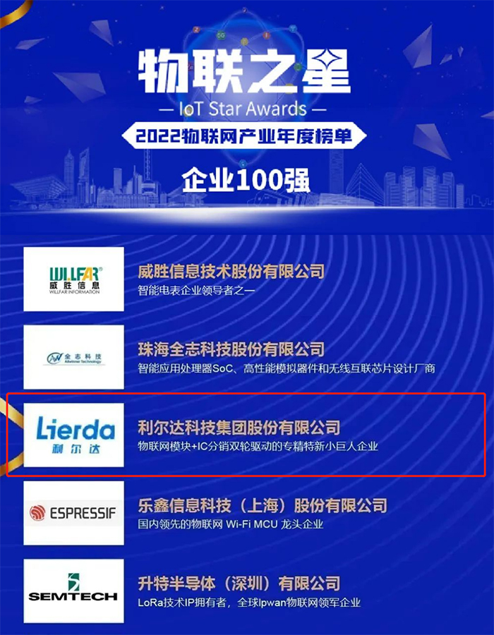 榜单聚焦以智能家居、车联网、智慧城市为主要场景的物联网市场,涵盖了医疗、教育、出行等各行各业。利尔达科技集团与华为、中国移动、阿里云、小米集团、中兴通讯、海康威视等知名企业共同入选“2022年度中国物联网企业100强”!