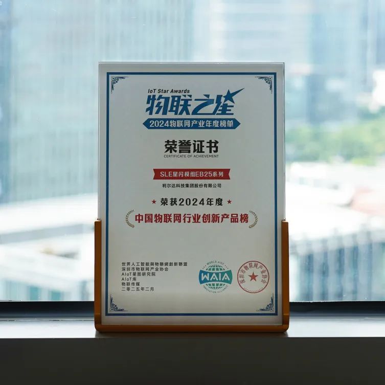 利尔达科技集团受邀出席,凭借卓越的技术实力与市场表现,斩获“2024年度中国物联网企业100强”称号,自主研发的EB25系列SLE星闪模组同时入选“2024年度中国物联网行业创新产品榜”。