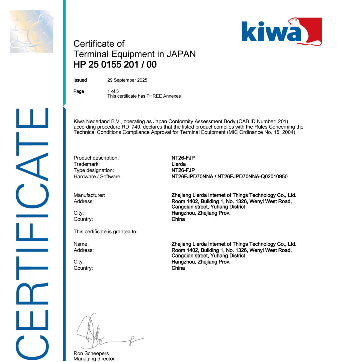 近日,利尔达科技集团专为日本市场量身打造的Cat.1无线通信模组NT26-FJP,成功取得了日本TELEC(电信设备技术符合性认证)与JATE(电信终端设备认证机构)双重认证。
