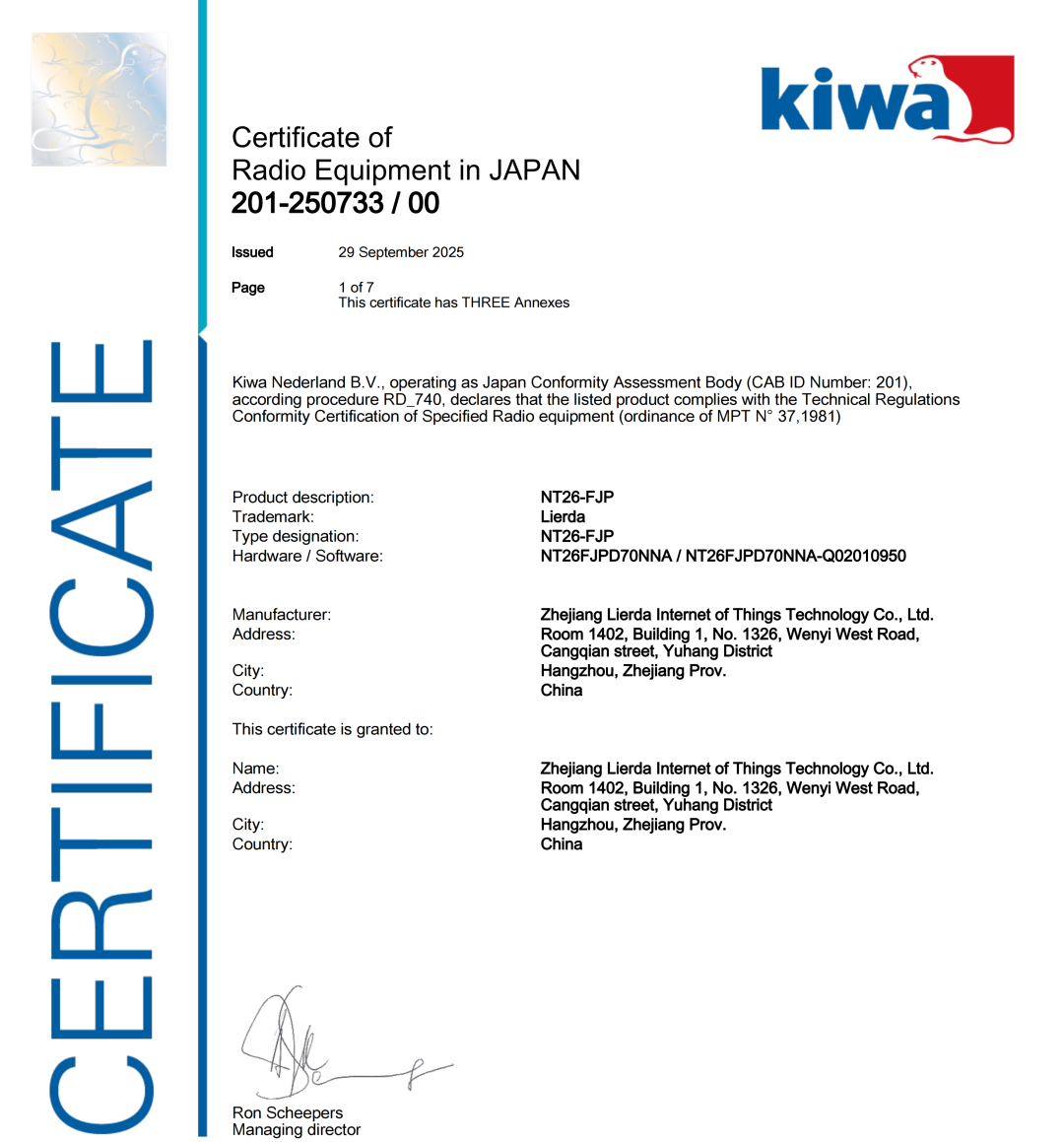 利尔达NT26-FJP模组通过日本TELEC、JATE双重认证
