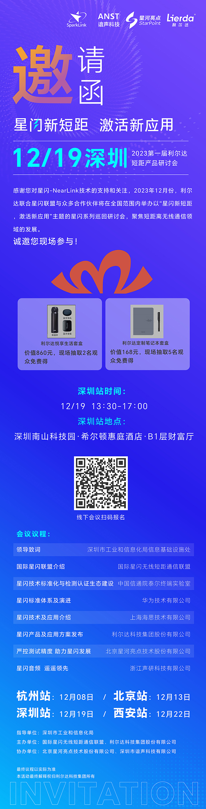 此次研讨会由中国信息通信研究院和利尔达科技集团股份有限公司主办,北京星河亮点技术股份有限公司、深圳市谙声科技有限公司协办,并得到了星闪联盟的大力支持。深圳站、西安站正在火热招募中,期待更多行业伙伴加入!