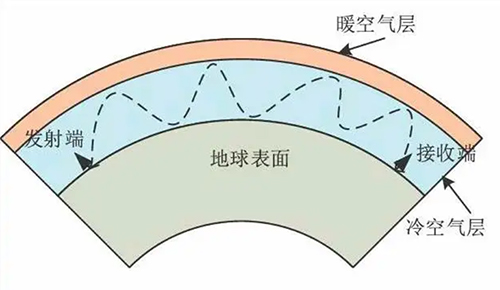 在大气波导发生时,地球大气中较高高度的低密度层折射率降低,使得电磁波向地面反射。此时,近地层中传播的电磁波的传播轨迹受到大气折射影响而弯向地面,当曲率超过地球表面曲率时,电磁波中的一部分会被陷获在波导层之内,如同电磁波在平板介质波导中传播一样。这种超折射现象具有传播损耗低、作用距离远的特点。