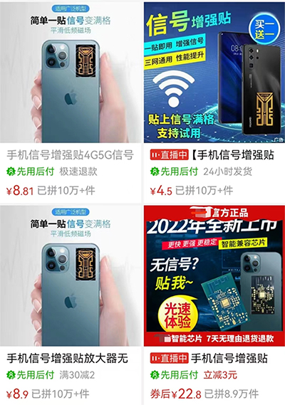 前几年,“手机信号增强贴”曾引起热潮,营销出来的作用正如其名,吸引超过十万人购买,而这股热潮近期正在卷土重来,各大购物软件上搜索“手机信号增强贴”最高可看见单品销量超十万。这个没有电力驱动、也没有天线连接、低价甚至不到十元的小玩意真的能发挥“简单一贴信号变满格”的作用么?