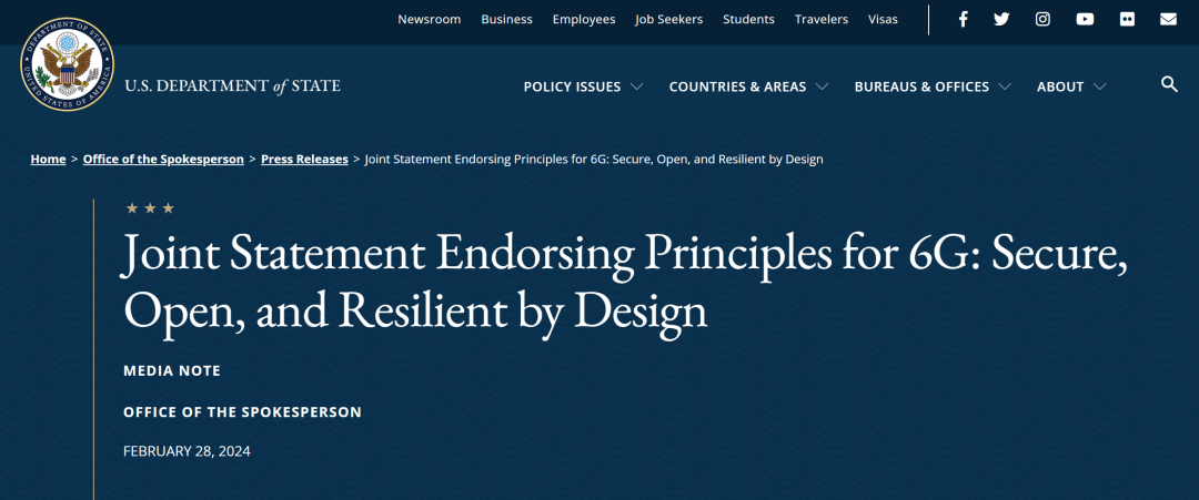 就在前不久(2月28日),美国国务院官网发布了一篇关于6G的公文,题为“支持6G原则的联合声明:安全、开放、弹性设计”。