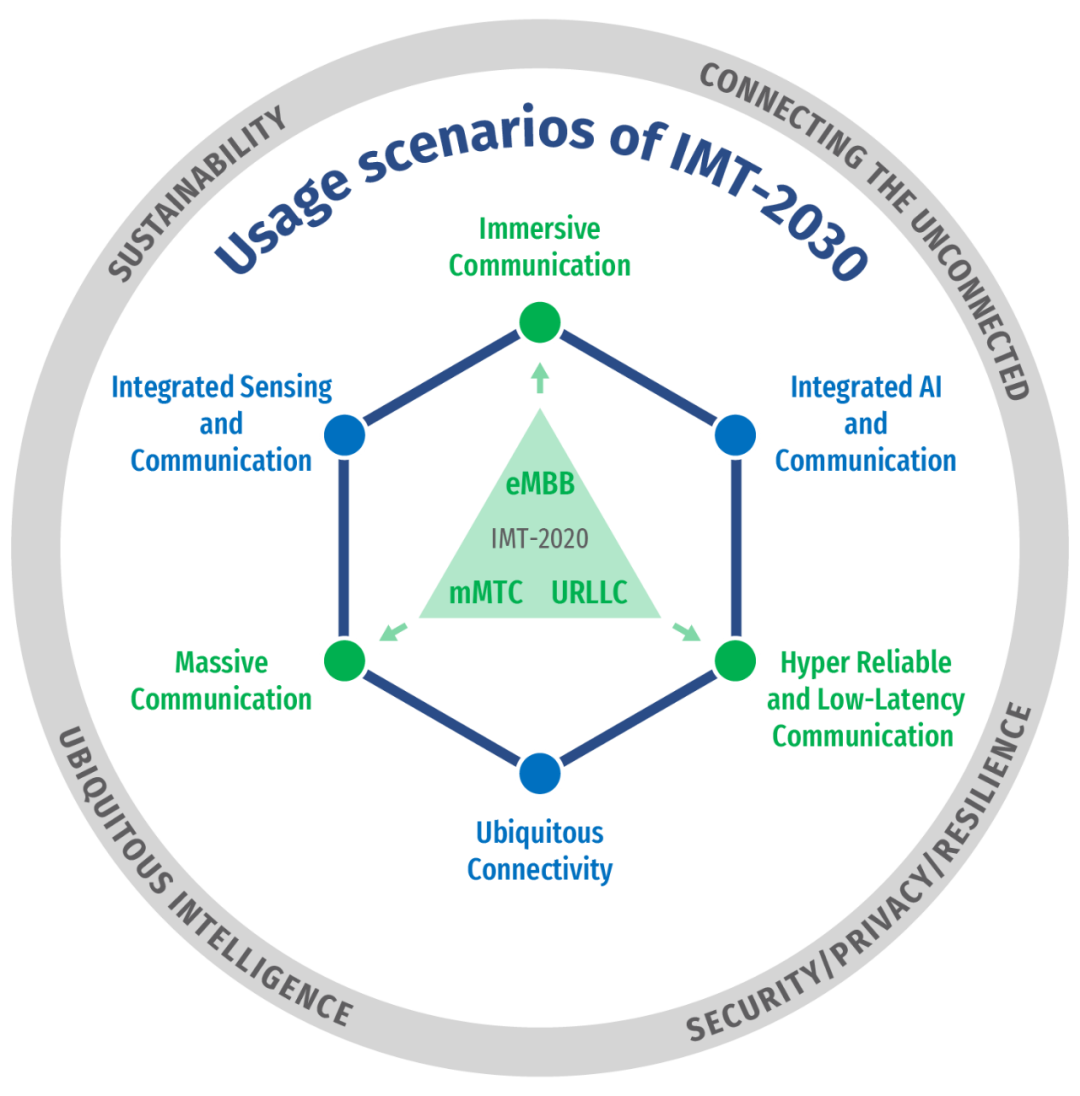 6. 感知与通信融合:这一场景有助于需要传感功能的新应用和服务。它利用IMT-2030提供广域多维传感,提供有关未连接设备的空间信息,以及连接设备、运动和周围环境的空间信息。该场景典型用例包括IMT-2030辅助导航、活动检测和运动跟踪(例如姿势/手势识别、跌倒检测、车辆/行人检测)、环境监测(例如雨水/污染检测)以及为AI、XR和数字孪生应用提供周围环境的传感数据/信息。