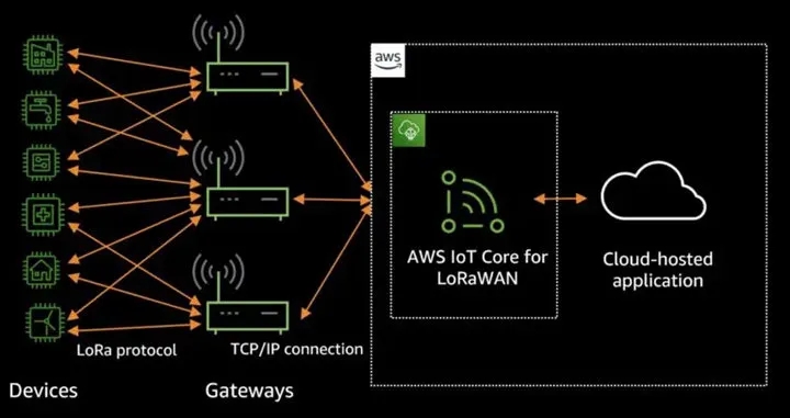 例如,亚马逊 AWS 发布过多个基于 LoRaWAN 的产品。AWS IoT 可支持 LoRaWAN 的消息,这意味着用户可以在 AWS 云服务器上使用 LoRaWAN 来连接、控制和管理自己的低功耗无线设备。同时,AWS 自研的通讯技术 Sidewalk 也是将 LoRa 调制技术融入其中。