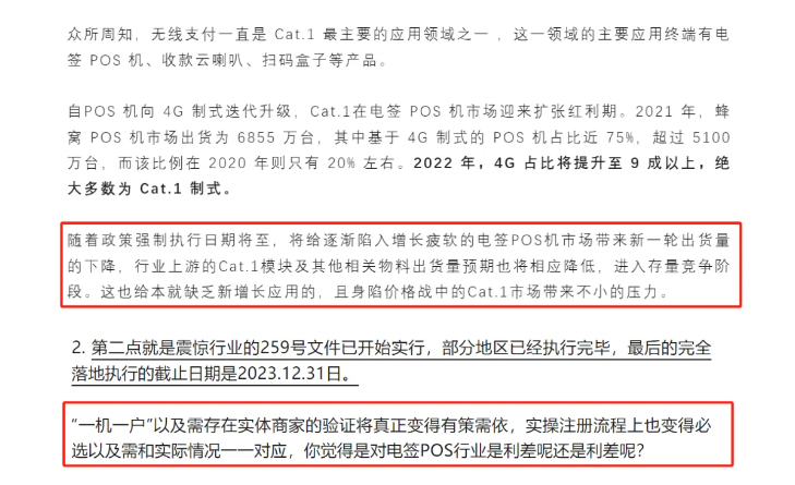 一时间,POS机行业被看衰的声音此起彼伏,并由此推断Cat.1在该领域的出货量将受到影响。其逻辑在于:电签 POS机需求下降→整机厂订单下降→Cat.1需求下降导致出货量快速减少。