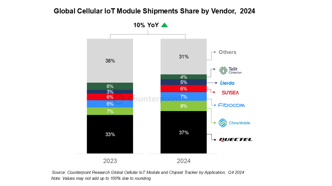 Counterpoint Research数据显示,2024年中国厂商在全球物联网通信模组市场持续领跑,移远通信、中国移动、广和通、日海智能、利尔达等五家头部企业合计占据全球市场69%的份额,展现出中国智造的强劲竞争力。