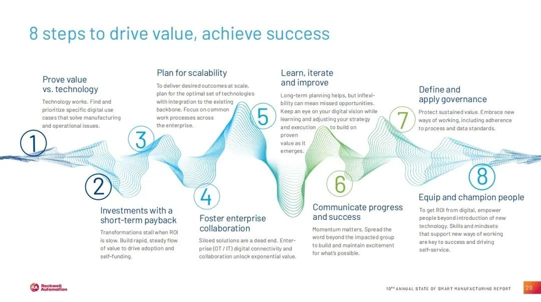 根据研究报告中提出的智能制造转型路径,企业在部署AI项目时应遵循敏捷起步、快速迭代、持续扩展的八步法,如上图所示。