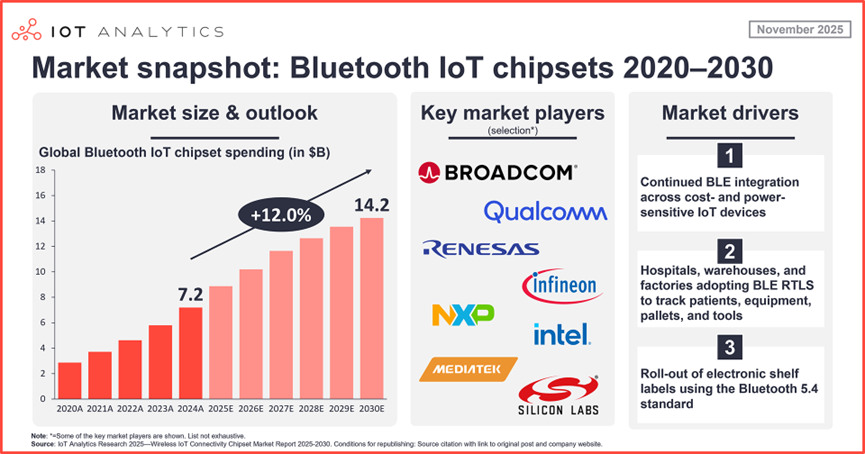 蓝牙支持的物联网连接规模位居第二,占所有物联网连接的比例为24%,在可穿戴设备、音频和智能家居等物联网市场成熟度较高。从蓝牙芯片的市场规模来看,IoT Analytics认为2024年其市场规模为72亿美元,预计到2030年将达到142亿美元,年复合增长率为12%。在这里,笔者对IoT Analytics发布的数据有一定的质疑:既然WiFi物联网连接规模大于蓝牙物联网连接规模,为什么蓝牙芯片的市场规模几乎是WiFi芯片市场规模的4倍?