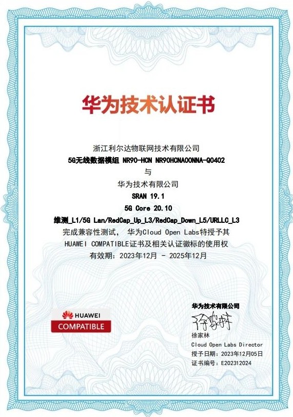 近日,利尔达5G RedCap模组NR90-HCN通过华为OpenLabs全球开放实验室的系列严格验证流程,完成兼容性测试,获得华为Cloud Open Labs授予的HUAWEI COMPATIBLE证书及其相关认证徽标使用权。