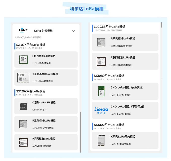 多年来,利尔达在LoRa领域深耕细作,LoRa模组出货量位居全球前列,在低功耗广域网(LPWAN)市场具有深厚的技术积淀。为客户提供一系列高性能、标准化的Sub 1G/2.4G的LoRa射频模组,不仅覆盖了各种全球常用频段(433/470/868/915/923等MIHz),还设计了各种灵活的封装(F/R/Q/X/H/S),以满足不同设备尺寸和环境的严苛要求。同时,它们还支持LoRa和FSK等多种高效的调制方式,充分确保数据传输的稳定性与安全性,为多元化应用场景提供了强大支撑,也完美适配了新国标要求,为用户自行开发符合标准的产品提供了强大的硬件支撑。