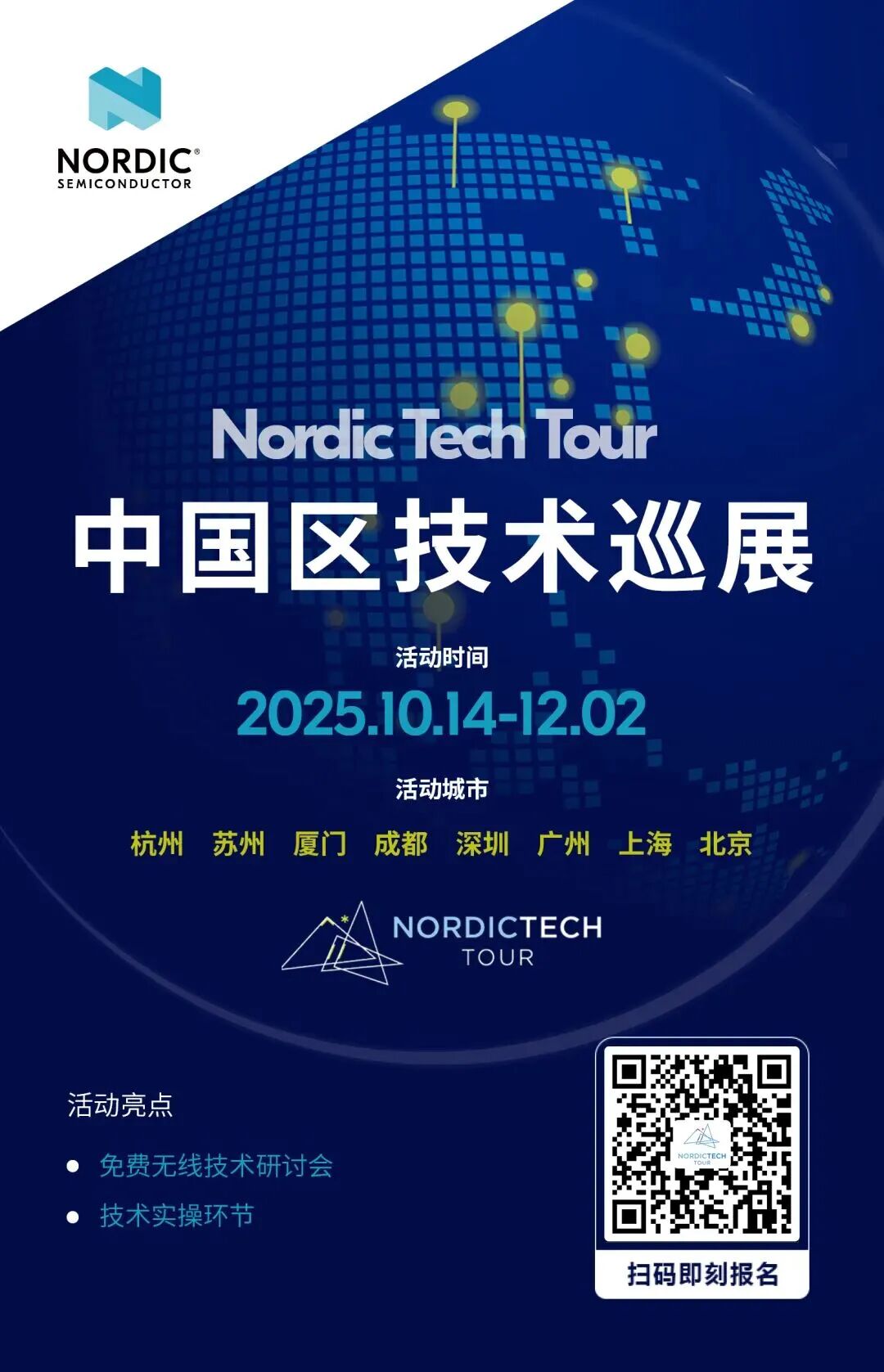 2025年10月中旬至12月初,Nordic Semiconductor将启动中国区巡回技术研讨会(Nordic Tech Tour),依次走进杭州、厦门、深圳、上海、北京等全国八大城市,深度展示前沿无线技术与创新解决方案。