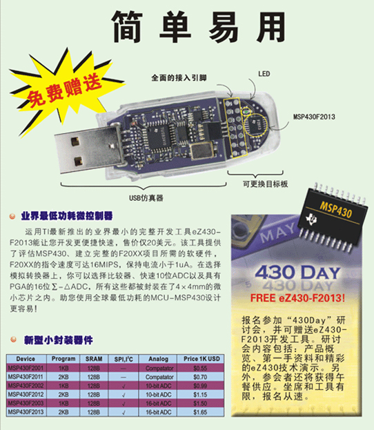 会上还将特别介绍TI 06年度的具有更高的性能,更强的功能模块的新型单片机MSP430F20XX和其USB接口型开发评估工具eZ430-F2013,使我们第一时间掌握到MSP430最前沿的信息,从而更好的把握市场的先机奠下了台阶。