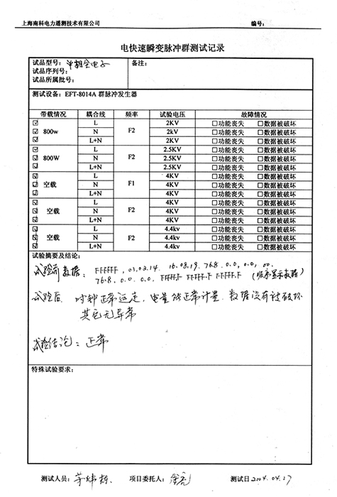 2004年4月17日,杭州利尔达单片机技术有限公司采用的MSP430FE427单片机内带计量的单相复费率电表在上海南科电力遥测技术有限公司通过了电快速瞬变脉冲群测试,工作正常,信息无变化,测试报告如下: