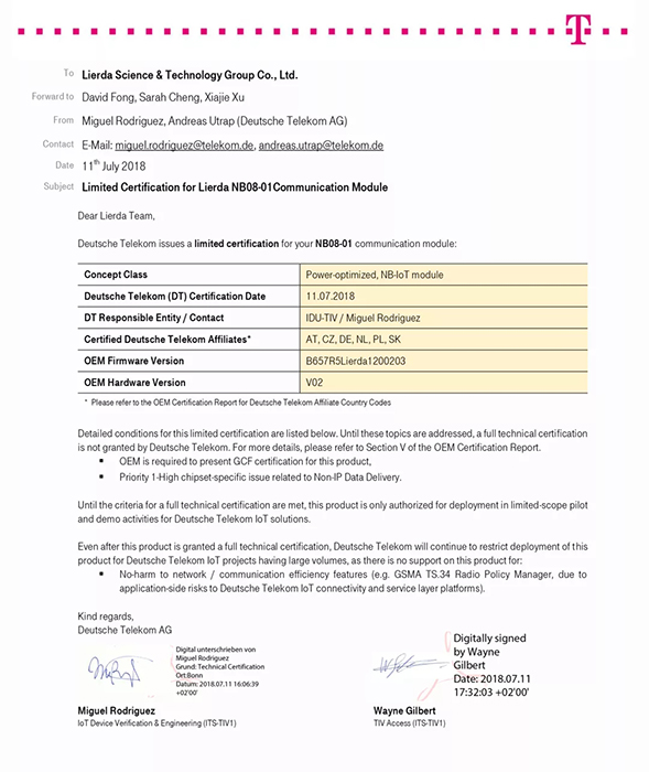 经过与德国电信长达半年的针对模组的严苛和全面的认证测试,以及多种NB-IoT应用产品整合,目前利尔达band8单频段模组NB08-01和全频段模组NB86-G已正式通过的德国电信实验室的认证,近期会在德国电信官网正式上线商用。