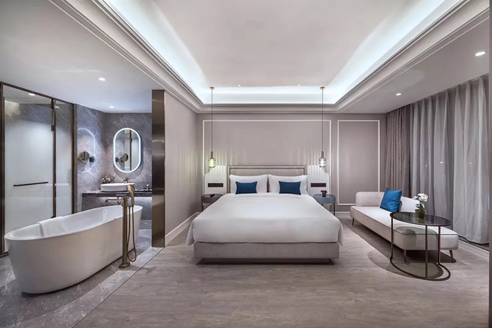 例如无继电器,零噪音,安静舒适。灯具3秒亮度变化和无级调光打造客房多种健康照明模式,可以营造出更好的温馨氛围有助客户入眠,助眠夜灯情况下灯带保持低亮度不刺眼、夜晚走入卫生间灯光自动调节至低亮度,不影响客人再次入睡。