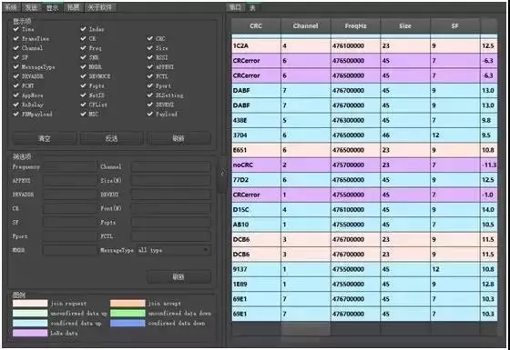 LoRa网络抓包分析功能:适配于所有LoRa产品,通过抓取空中的LoRa射频数据进行 捕获,并对应LoRaWAN协议对其信息进行解析,通过表格呈现,并可以通过条件筛选获取想要的数据。