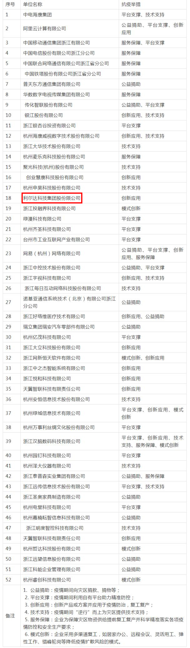 3月18日,浙江省物联网产业协会发布了一则《关于通报表扬一批新冠肺炎疫情防控工作表现突出单位的通知》,表扬了一批在战疫情、促发展的特殊时期表现突出的单位,利尔达科技集团股份有限公司(股票代码:832149)、阿里云计算有限公司、杭州海康威视数字技术股份有限公司、网易(杭州)网络有限公司等企业赫然在列。