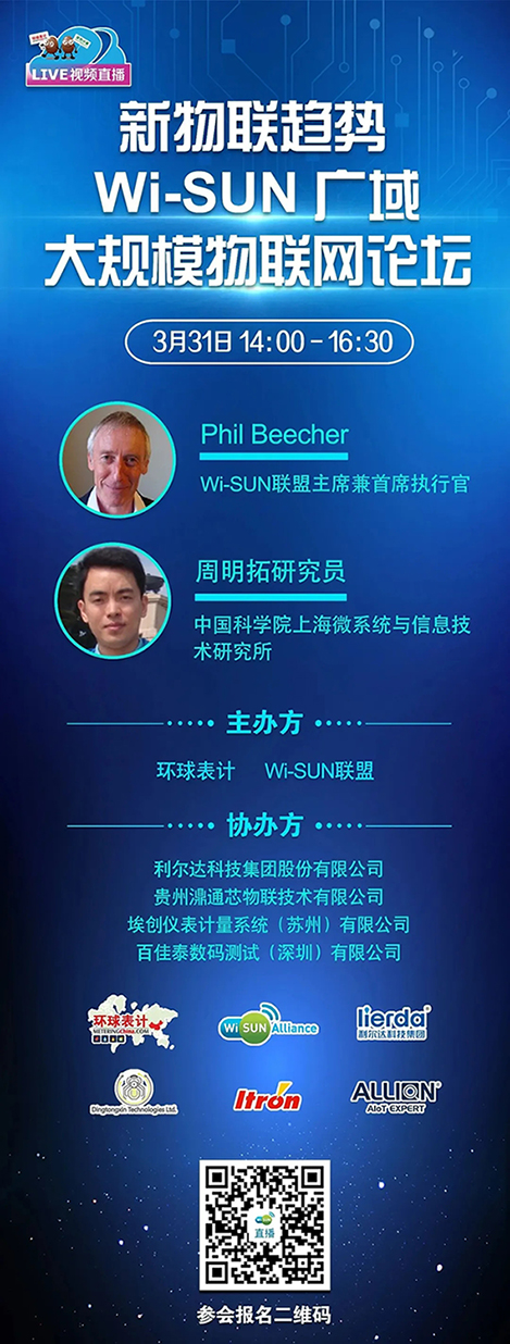 3月31日,由环球表计和Wi-SUN联盟联合主办,由利尔达、濎通芯、埃创仪表和百佳泰承办的千人直播论坛,现已开始报名,此次论坛同时邀请到中国科学院和Allion Labs的专家参与分享,欢迎扫码报名~