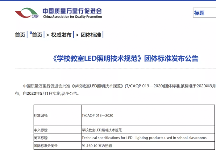 由中国质量万里行促进会归口的团体标准T/CAQP013-2020《学校教室LED照明技术规范》于3月31日正式发布,并于5月1日开始实施,它标志着我国中小学校教室健康照明产品应用在标准化、规范化方面又迈出了重要一步。它将有力助推我国近视防控,为改善教室视觉环境,特别为孩子视力健康营造放心、健康、舒适的照明环境,对教室健康照明相关要求提出了更高的规范要求和技术促进。