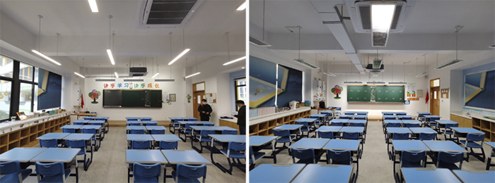 教室智能健康照明光环境改造历时仅20天!教室灯由原来的12盏普通LED灯改成9盏智能教室灯,降低能耗的同时,极大提升照明质量。桌面维持标准光照度和均匀度、黑板维持平均照度都优于最新的标准100%以上;眩光值下降;教室见光不见灯,对眼睛无刺激,学生上课更专注。