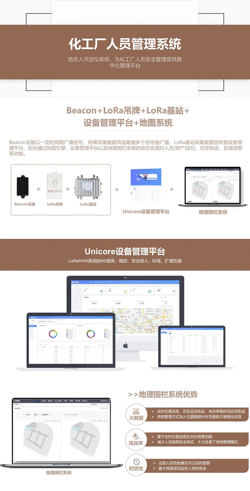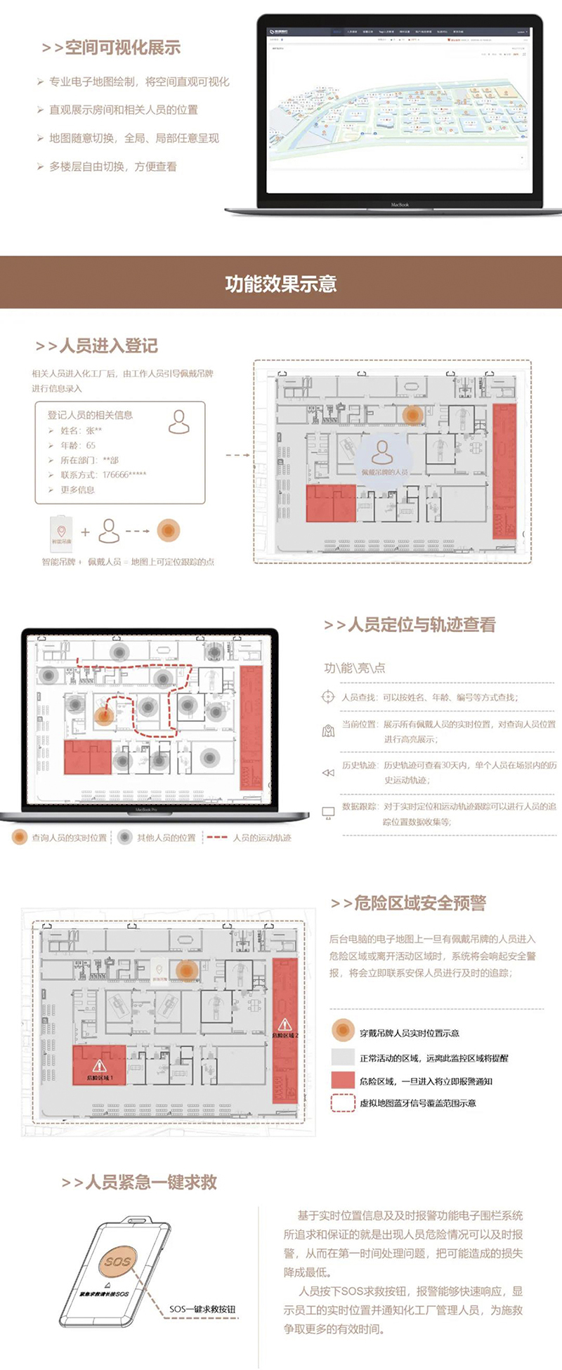 传统的制造业企业普遍存在人员位置不可知、人员监管系统效率低、无可视化智慧监管平台、危险区域难管控等问题。利尔达化工厂人员定位管理解决方案有效结合人员定位系统,为化工厂人员安全管理提供数字化管理平台,具有人员实时定位管理、安全智能预警、轨迹追踪及回溯、访客安全管理等优势。