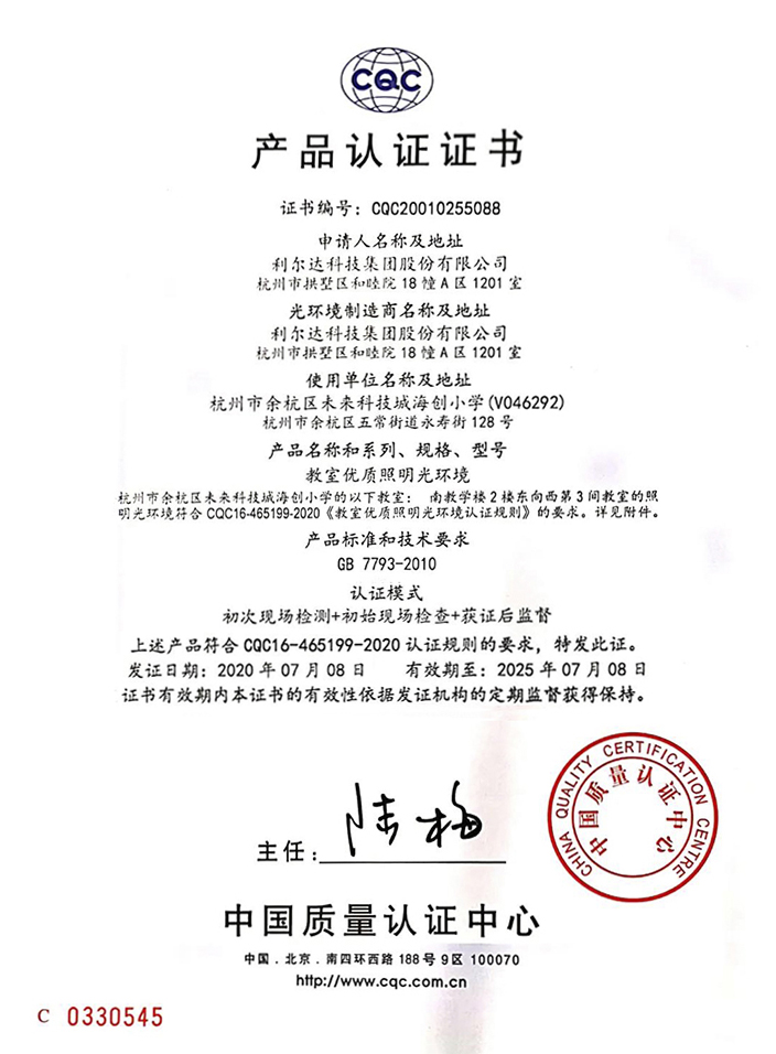 截至2020年09月01日统计,已获得的教室优质照明光环境认证证书共12家。利尔达客思凭借近年来在健康照明市场的不断深耕,在CQC中国质量认证中心实地现场监督检测下,获得了“教室优质照明光环境”认证证书。