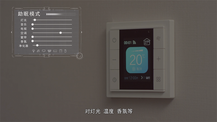 休憩睡觉时:通过语音、面板、手机等控制方式,一键切换到睡眠模式,窗帘、灯光、电视等都会自动关闭,空调切换成睡眠模式,语音音箱响起轻柔助眠音乐以及香薰自动打开,帮助用户轻松入眠。