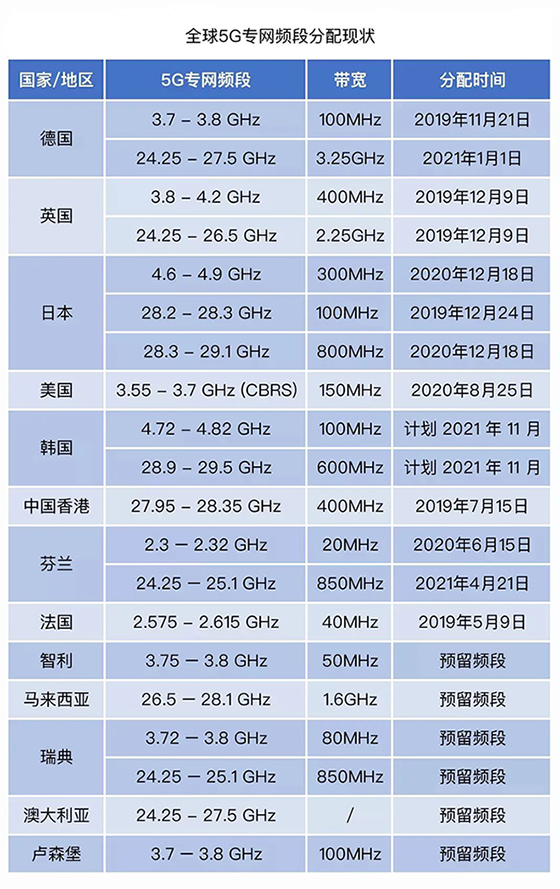 为优先帮助企业独立部署5G专网,推动5G专网创新与繁荣,2019年11月21日,德国联邦网络管理局(BNetzA)正式对外开放3700-3800MHz的5G专网频段申请;2021年1月1日,德国再次开放24.25-27.5GHz频段。企业只需按照流程申请并支付较低的费用,就可获得这些5G专网频段来自建5G专网。