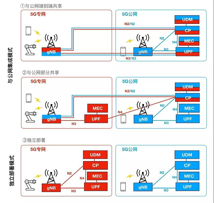 3、独立部署,指企业独立部署一张包括核心网CP、UPF、MEC、gNB等所有网元的5G专网。