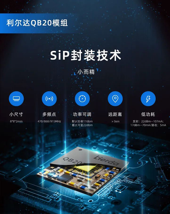 利尔达物联网全新发布的SiP芯片模组基于SX1262 DIE平台研发,包含QB20-C7和QB20-C8两款,仅工作频段与发射电流存在区别,满足欧标和美标用户需求。