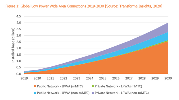 LoRa技术即远距离无线电(Long Range Radio),顾名思义它最大特点就是在同样的功耗条件下比其他无线方式传播的距离更远,实现了低功耗和远距离的统一,它在同样的功耗下比传统的无线射频通信距离扩大3-5倍。据专业机构预估,到2030年LPWAN连接数将高达40亿。其中全球私有LPWAN连接总数达到10亿枚,年复合增长率25%,LoRa模组连接总数将近 4亿枚,中国LoRa模组1.33亿枚,年复合增长率40%,市场总容量为40亿人民币,前景广阔。