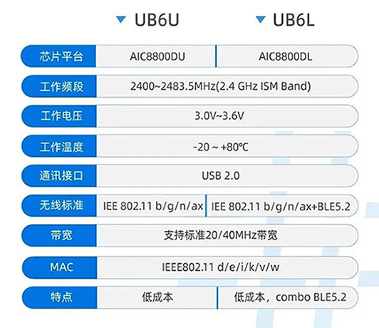 UB6U&UB6L模组是两款支持 802.11b/g/n/ax@2.4G(其中UB6L模组 combo BLE5.2)无线标准的低成本USB接口Wi-Fi 6模组,其WLAN功能支持USB 2.0接口;模组支持20MHz&40MHz带宽,以确保向后和网络兼容性。