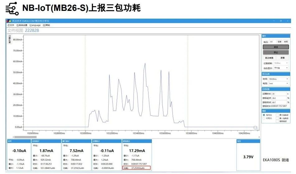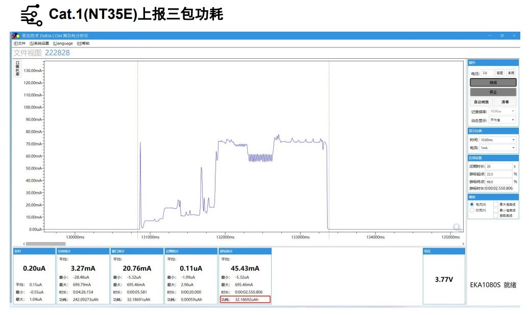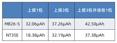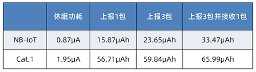 NB-IoT 与 Cat.1 模组使用不同通信模型在休眠模式应用下的功耗对比,每包数据长度50Bytes,测试模型包括:上报一包数据、连续上报三包数据、连续上报三包数据同时服务器下发一包数据。NB-IoT 与 Cat.1 模组功耗数据对比如下: