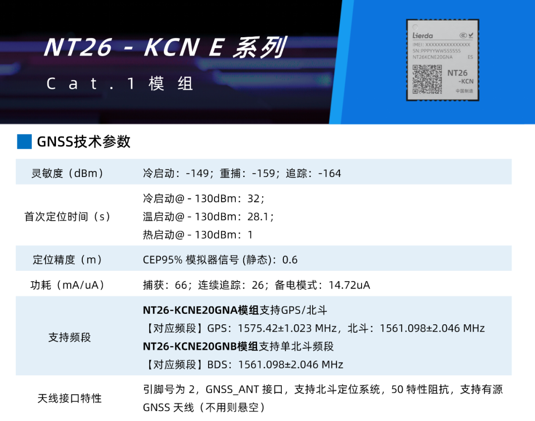 利尔达NT26 - KCN E系列模组基于3GPP R14 Cat.1 bis标准研发,具有体积小、功耗低、搜星时间短,定位精度高,抗干扰能力强等特点。它支持国内三大运营商网络,配备丰富的接口,包括 USB2.0、UART、USIM 卡等。该定位模组开发了2个版本——Cat.1+GPS/北斗版本和Cat.1+纯北斗版本,客户可按需选择
