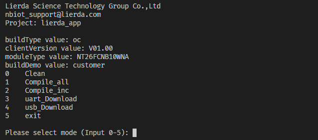 借助利尔达精心打造的工具链,可以高效编译固件并将其下载到模组。您可以选择“1”进行编译代码,选择“3”下载固件到模组。