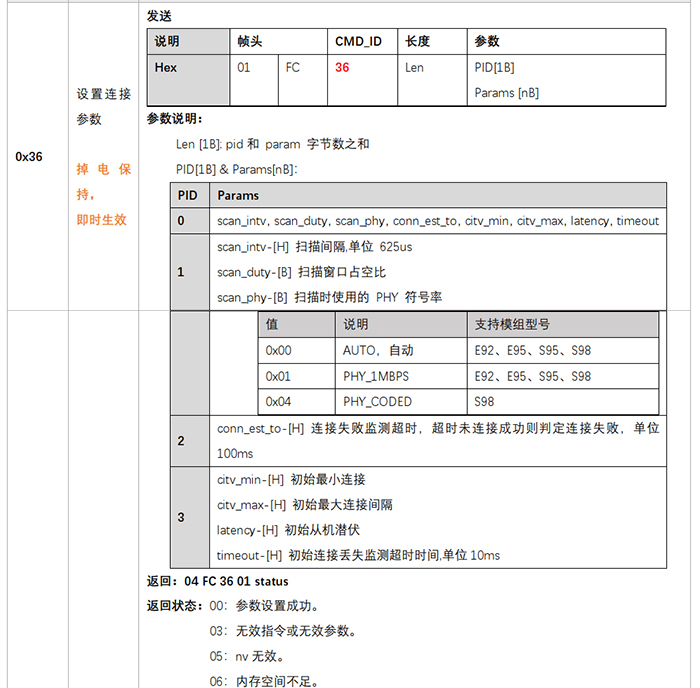 0x00 A0=160*625us=100 000us=100ms//推荐使用默认值100ms,此处扫描间隔,跟ID=0x34指令中的扫描间隔含义是一样的,区别是使用场景不同,比如说主机保持1V7连接,突然与1个从机的连接断开了,那么主机就直接用0x36指令发起连接。