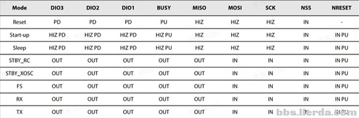 SX126X和LLCC68系列模组主芯片在各个状态下的各个IO的状态如下图所示: