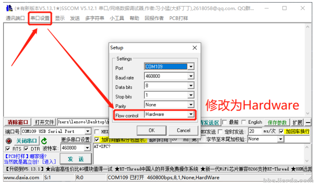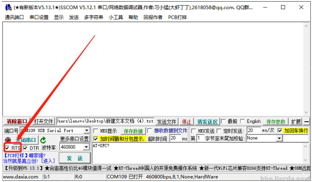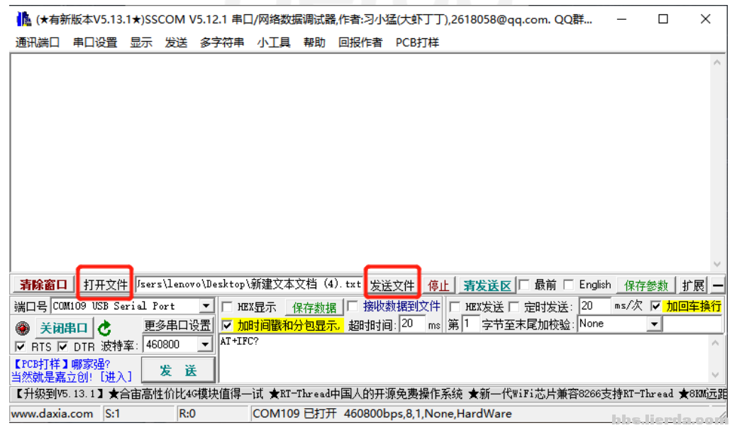 通过SSCOM发送文件的功能,可快速向模组发送AT指令。在发送文件时把串口波特率修改为460800bps(AT+IPR=460800)以便触发高速率通信下的硬件流控指示。