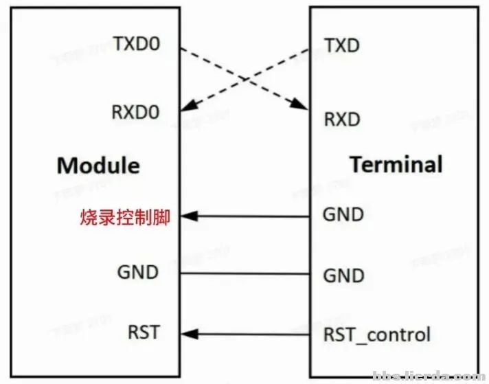 使用Debug 烧写方式,模组上的VCC、GND、TXD0、RXD0、烧录控制脚、EN 连接到对应的引脚,如下图3。