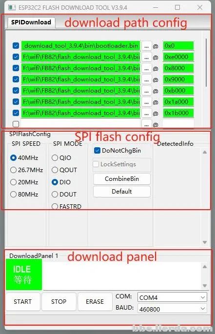 ①Download path config:点击”...”导入需要烧录的bin 文件,并填入对应的烧录地址,勾选bin 文件前面的复选框为”√”