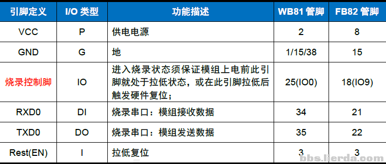 (2) 烧录控制脚为控制模组进入烧录状态引脚,进入烧录状态须保证模组上电前处于拉低状态,或在拉低后触发硬件复位。