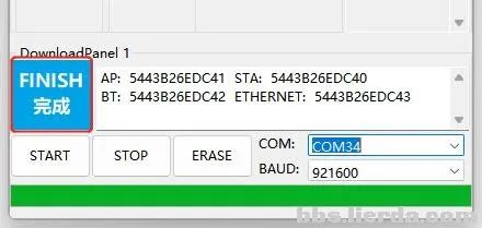 点击START 开始下载,下载过程中,下载工具会读取flash 的信息和芯片的MAC 地址。下载完成后,下载工具的界面如图6所示。