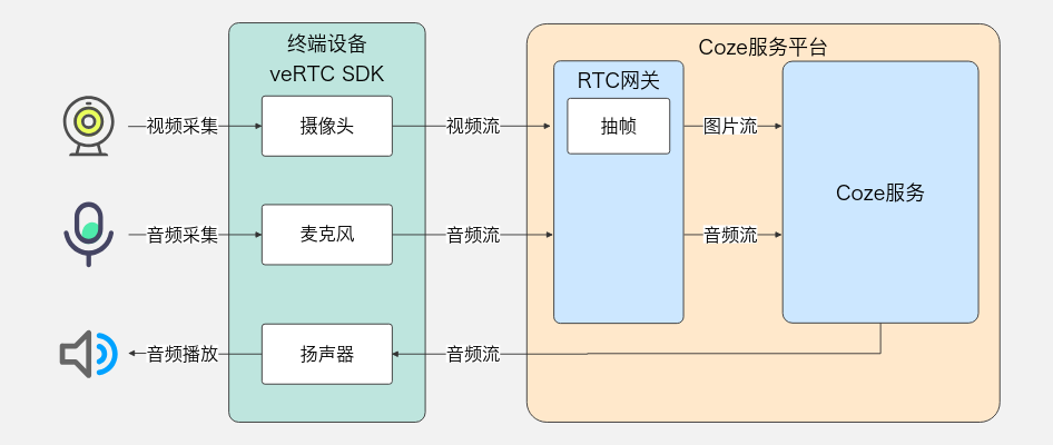 目前扣子、火山引擎(豆包)、腾讯云、阿里等平台都支持通过RTC方式接入端设备,并提供了全面的实时音视频通讯解决方案,不过限制在于需要使用平台提供的SDK。这些SDK对硬件适配有要求——仅支持安卓、微信应用、linux等平台。