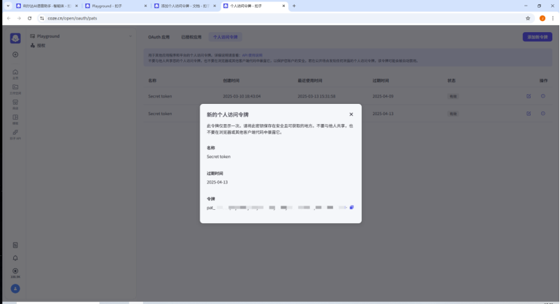 登录扣子平台个人访问令牌,添加新个人令牌(如果已有令牌,无需新申请)。