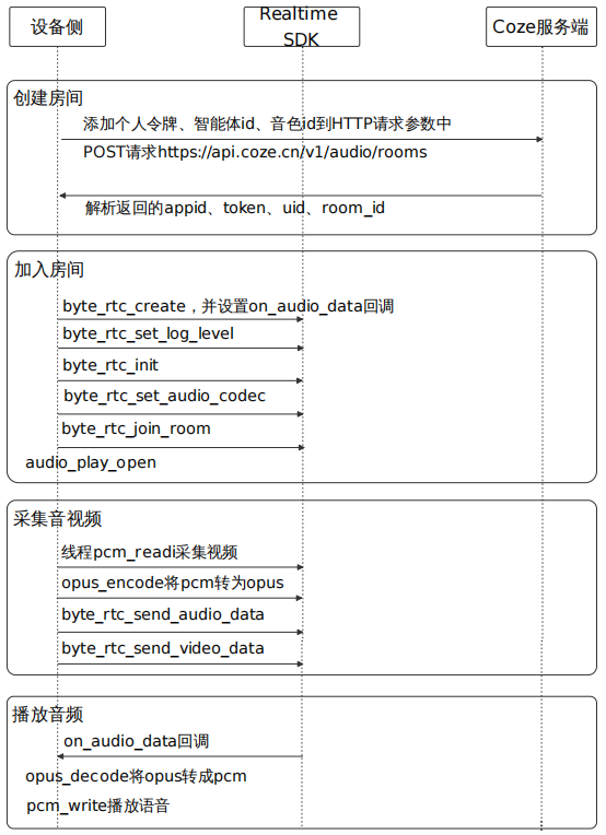 设备端通过Realtime SDK与Coze服务器进行实时音频通信的完整流程,包括创建房间、加入房间、采集音视频、发送音频以及播放音频的详细步骤。